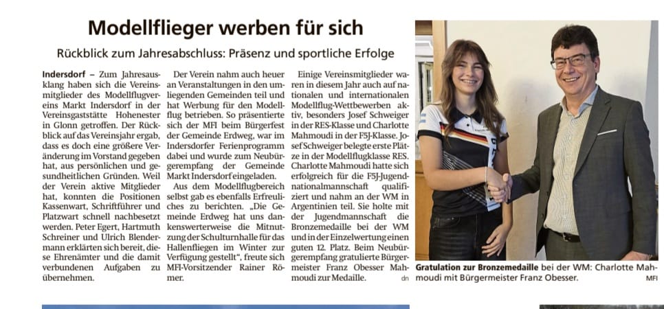 Dezember 2025: Ein toller Erfolg für Charlotte Mahmoudi. In der Klasse F5J hat sie die Bronzemedaille in der Mannschaftswertung gewonnen. Bürgermeister Obesser gratuliert und es wurde dieser Bericht in den Dachauer Nachrichten veröffentlicht.